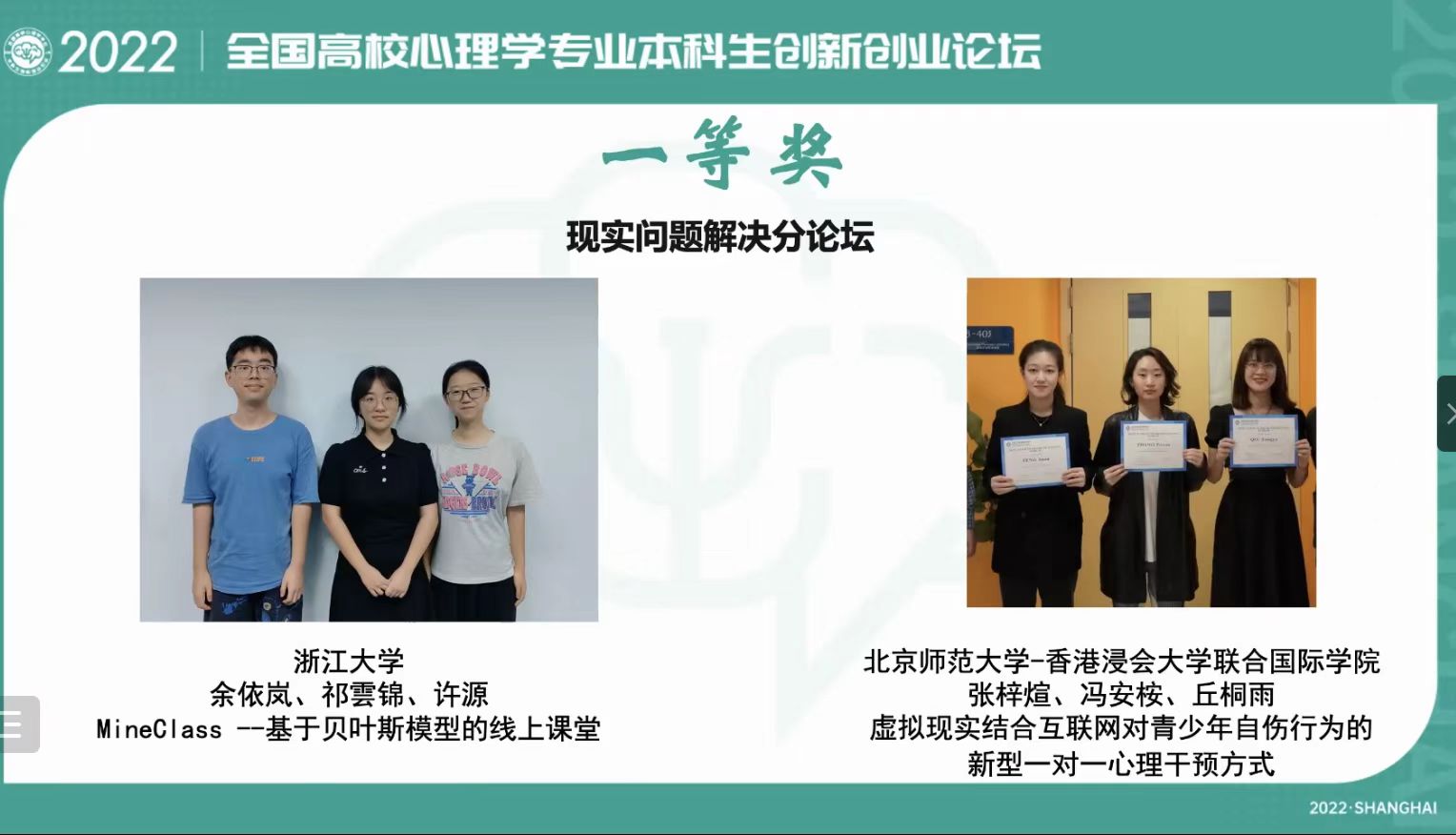 2022年8月26日,由教育部高等学校心理学类专业教学指导委员会主办,华东师范大学心理与认知科学学院、教育部心理学拔尖学生培养模式改革虚拟教研室共同承办的“全国高校心理学专业本科生创新创业论坛现场展示”在线上顺利举行,我校 生命科学系应用心理学专业2020级的张梓煊、冯安桉、丘桐雨在邢琳娜老师的指导下凭借作品《虚拟现实结合互联网对青少年自伤行为的新型一对一心理干预方式》,荣获“现实问题解决分论坛”一等奖。
