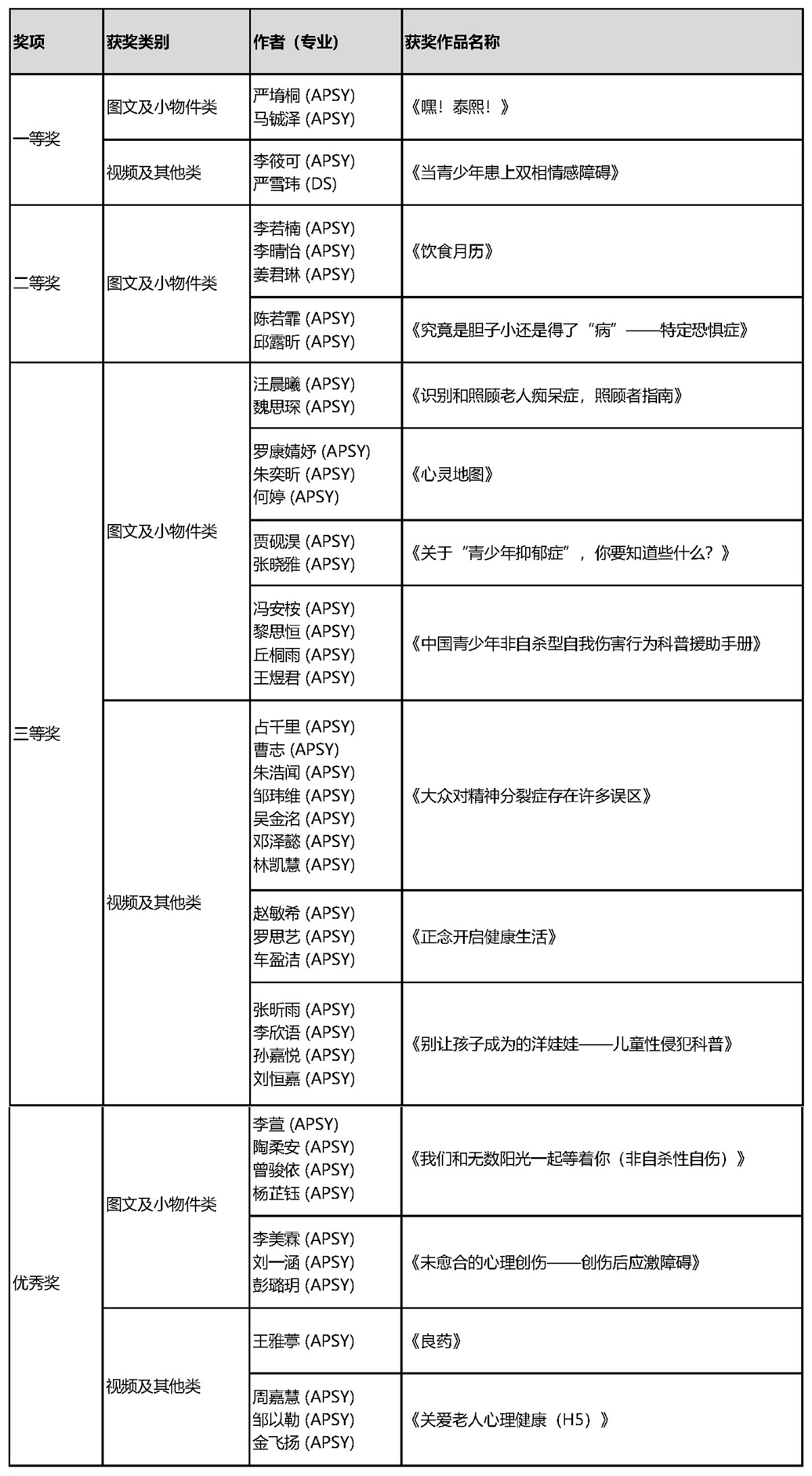 优秀作品后续将由主办单位用于精神心理相关知识的展览、宣传、推广、及广播等活动,恭喜各位获奖同学。