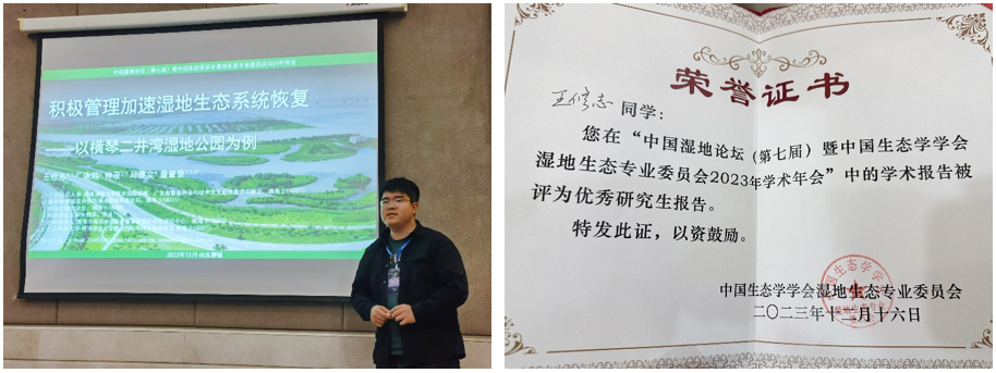 生命科学系环境科学专业与香港浸会大学联合培养的博士研究生王修志参加会议并作了题为《积极管理加速湿地生态系统恢复——以横琴二井湾湿地公园为例》的口头学术报告,分享其所在研究团队在横琴二井湾湿地公园进行生态恢复的实践成果与生物多样性保育成效。该报告获得与会专家的肯定,王修志获评优秀研究生报告奖。