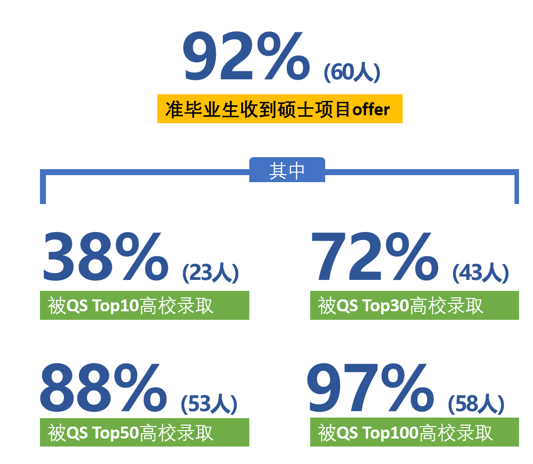 统计学专业2024届准毕业生共65人。截至4月17日,据不完全统计,统计学专业60位(92%)准毕业生共收到200份来自海内外高校的录取通知书。其中,收到2024年QS世界大学排名前100高校offer共166份(占比83%),排名前50高校offer共111份(占比56%),排名前30高校offer共75份(占比38%),排名前10高校offer共31份(占比16%)。在60位已收到offer的申研学生中,38%被2024年QS前30高校录取,72%被前30高校录取,88%被前50高校录取,97%被前100高校录取。