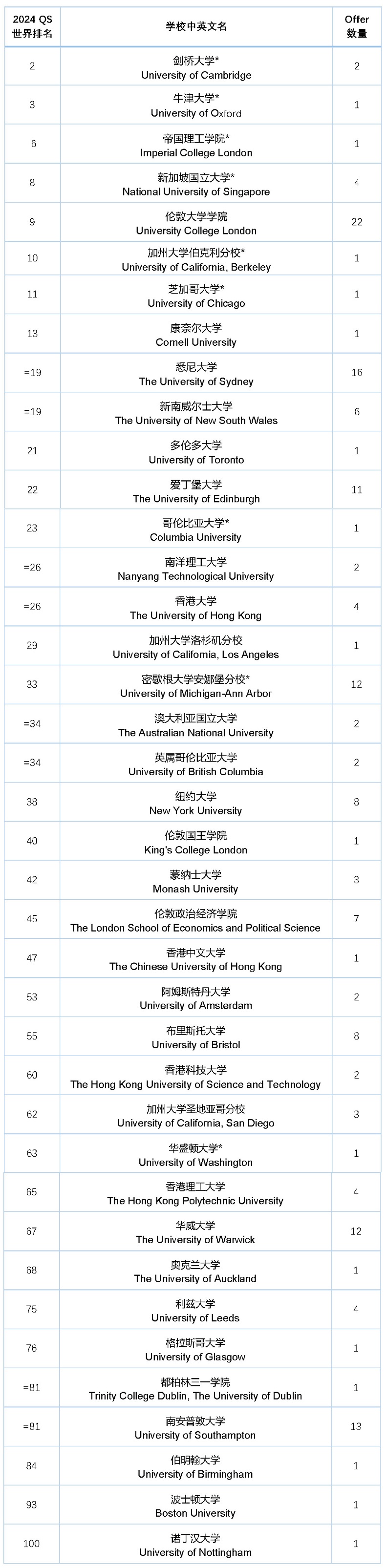 —— 2024届申研准毕业生收到的QS前100高校offer数量 ——