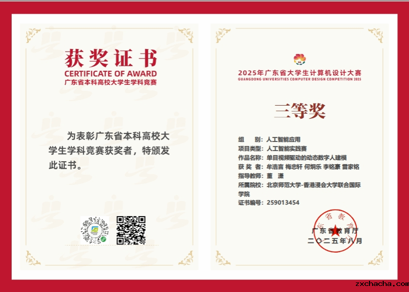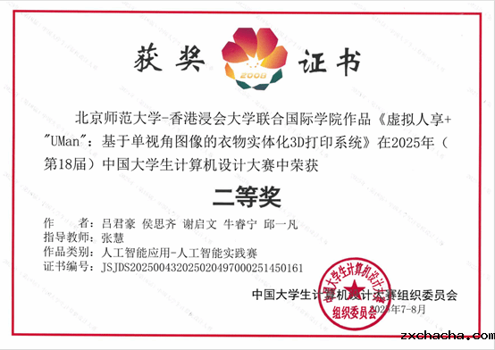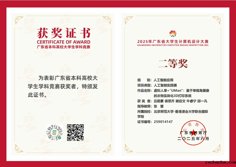 近日,2025年(第18届)中国大学生计算机设计大赛获奖名单公布,BNBU优米彩票app计算机科学系吕君豪、侯思齐、谢启文、牛睿宁以及工商管理学院会计系邱一凡组成的团队的作品《虚拟人享+“UMan”:基于单视角图像的衣物实体化3D打印系统》荣获大赛国赛二等奖。