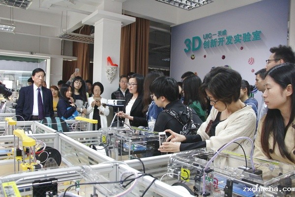 在揭牌仪式后,众多慕名而来的师生来到实验室一看究竟。实验室里,3D打印机正井然有序地工作着。旁边的架 子上摆着由同学们自己设计和打印出来的3D模型。计算机专业的同学向观众们介绍各种不同的3D建模方式和软件。CST的刘玉老师也通过PPT详细介绍各款 3D打印机,并演示了如何做出一个3D打印模型。