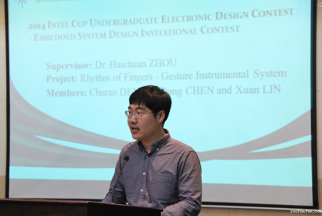 获奖学生代表林暄同学现场为嘉宾和观众们详细讲解了他们的参赛作品《指尖旋律——手势音乐演奏系统》(rhythm of fingers)。他以流利的英语介绍了创意的来源、制作的过程以及所采用的技术。