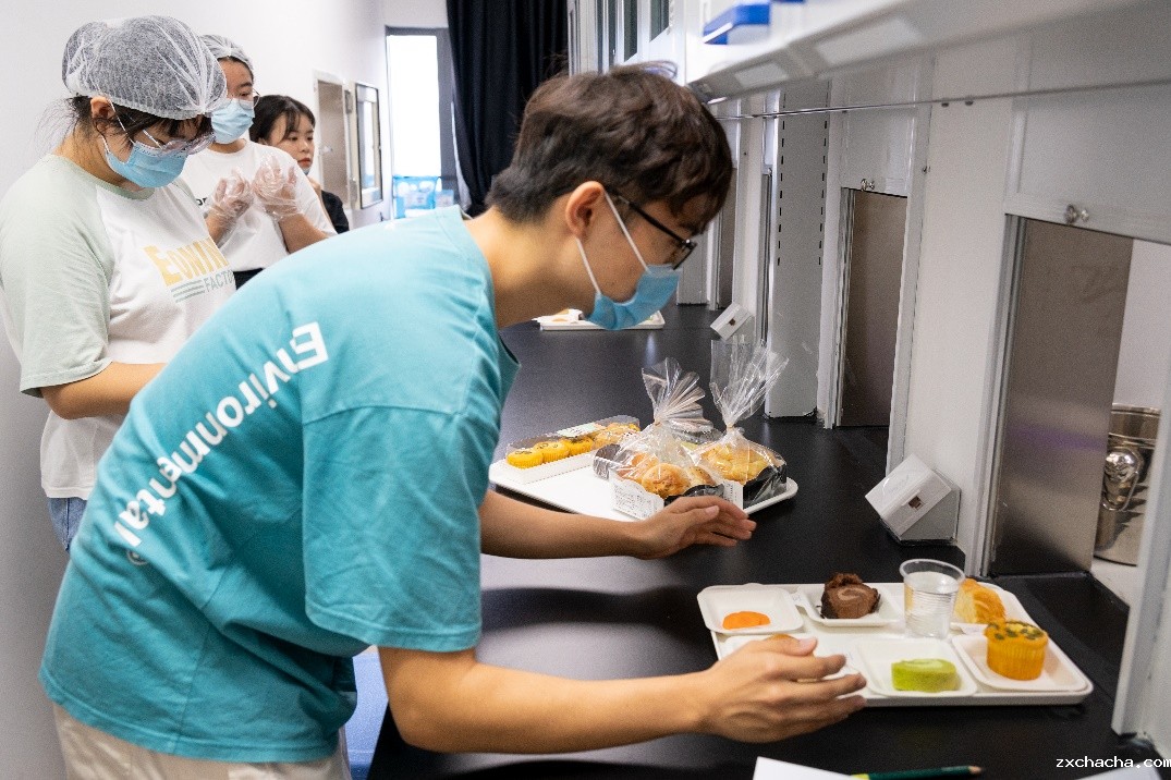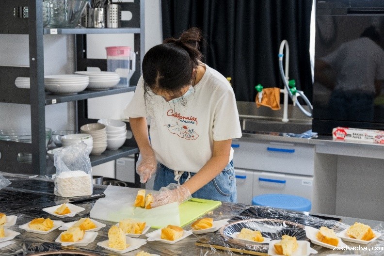 学生志愿者正在T8-515实验室厨房进行产品准备工作