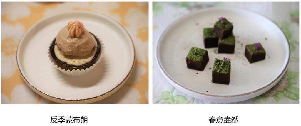 下午一点三十分,“瑰莉之夏”、“可甜可咸的布利尼”、“柑橘星球”、“桂馥芋香”等色香味俱全的美食纷纷现身。“反季蒙布朗”, 来自法国的秋天与来自纽约的奇思妙想,竟在相隔数千公里外的广东珠海进行了反季杂交。没有冬日的珠海,就让清爽的反季蒙布朗带给你温柔夏日。“多谷披萨” 饼底由土豆、红米、鹰嘴豆、青稞、葵花子以及南瓜子混合制作而成,在提供所需碳水化合物同时南瓜子和葵花子所富含的优质脂肪酸能够提供更佳的饱腹感。师生们被产品精致的造型、诱人的香气以及令人眼前一亮的创新想法所吸引,每个人都迫不及待地去品尝自己心仪的产品。