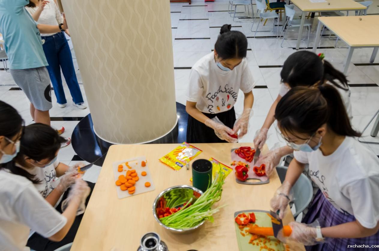 “洗净、削皮、切片……”全程戴手套操作。心灵手巧的食品专学女生们纷纷化身“厨房小当家”,处理食材起来一丝不苟。萝卜、甜椒、西芹、黄瓜、小番茄……对食材的选用,食品专业学生不仅兼顾了营养价值也确保了游戏的趣味性,希望同学们在玩得开心的同时也能关注到这些果蔬的营养价值。