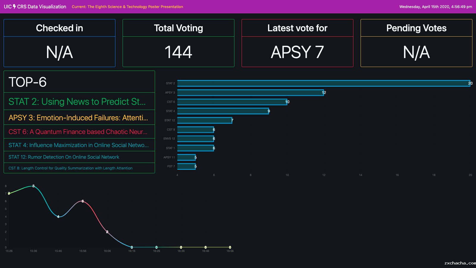 值得一提的是,评委和师生们用于线上投票及实时计票的活动管理系统Conference Registration System(CRS)为2016级计算机科学与技术专业伍正豪、邓仁杰和2017级数据科学专业梁昌源自主研发,该系统可简化活动的管理流程,提高效率。系统在2019年的第七届海报展已投入使用,今年三位同学基于原有的系统做了升级,开发了无密码注册系统、自动评分系统等。当天,共有291人注册观展,144人为心仪的海报投票。