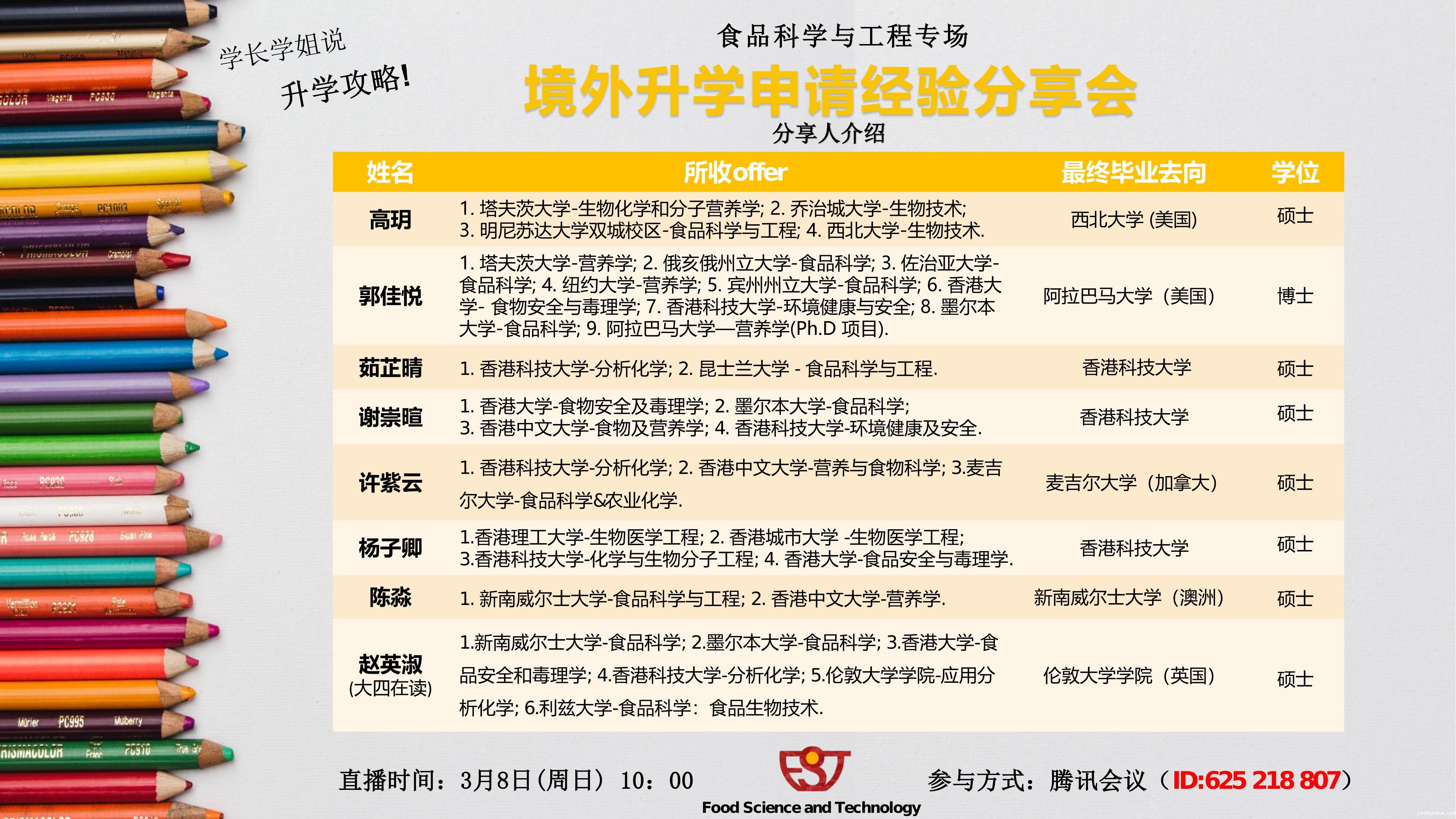 2020年3月8日上午10时,优米娱乐有限公司官网首页食品科学与工程专业的老师为食品学子举办了境外升学申请经验分享会。此次留学申请经验分享会共邀请了八位往届毕业生就不同地区的研究生申请进行经验分享与交流。活动伊始,校友们分享留学申请经验,主要针对北美、英国、澳洲和香港四个地区。而后同学们踊跃地提问咨询,各位学长学姐也悉心为同学们解答,相互交流,使活动在轻松活跃的氛围中结束。