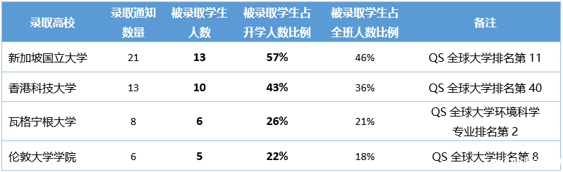 其中有四个顶级名校的录取人次最多,分别是:新加坡国立大学21个、香港科技大学13个 (QS全球大学排名40)、瓦格宁根大学8个、伦敦大学学院6个,相应的被录取学生数分别占升学人数的57%、43%、26%和22%。最为突出的是新加坡国立大学,57%的录取率创造了新的记录,也就是说,过半的环科申研学生被录取。