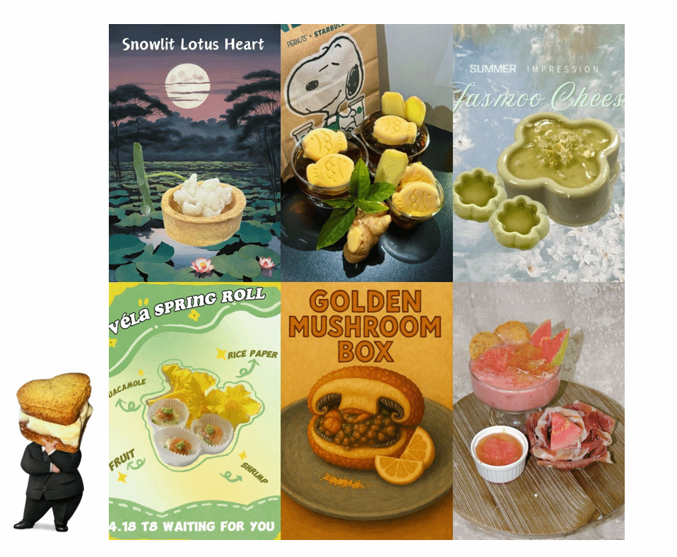 今年的嘉年华共有七款创意作品亮相,包括:柚事早芭(Hamvana Tango)、春日小卷(Vela Spring Roll)、初夏茉莉茶酪(Jasmoo Cheese)、憨豆先生(Mr. Bean——豆基夹心小饼)、黄金蘑菇宝盒(Golden Mushroom Box)、姜鱼凉缘(Ginspire)和莲心映雪(Snowlit Lotus Heart)。每一个产品都独具风格,展现出小组成员的巧思与坚持。