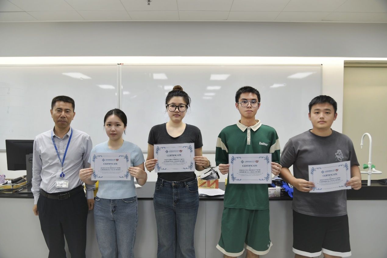 徐宝军教授(左一)为“姜鱼凉缘”制作组(许心仪、邵迦琪、邓越、胡佳涛)颁发“最具商业价值奖”