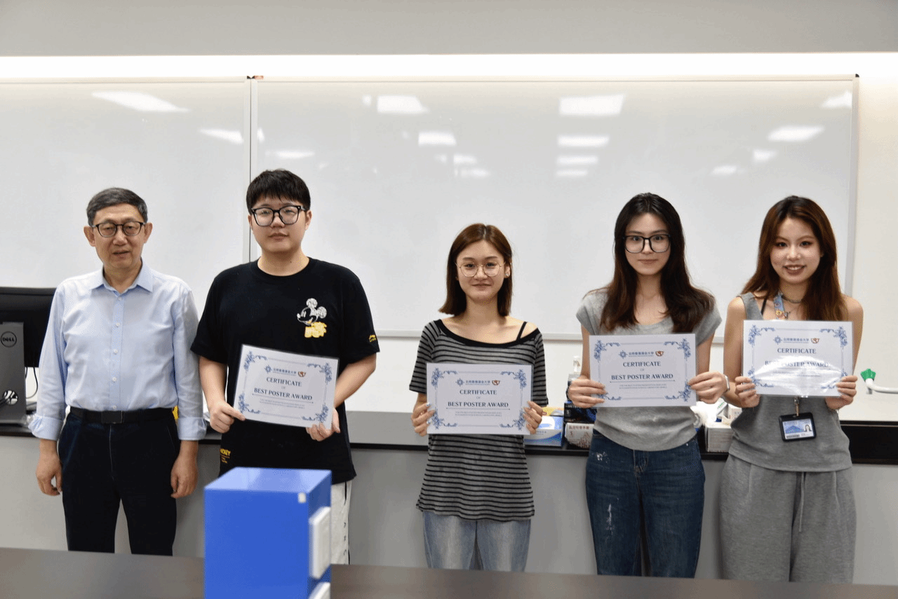 罗晓宇博士(左一)为”柚事早芭”制作组(郑嘉萱、孔晖珏、张璟瑜、邱馨苇、杜奂霖)颁发“最受欢迎奖”