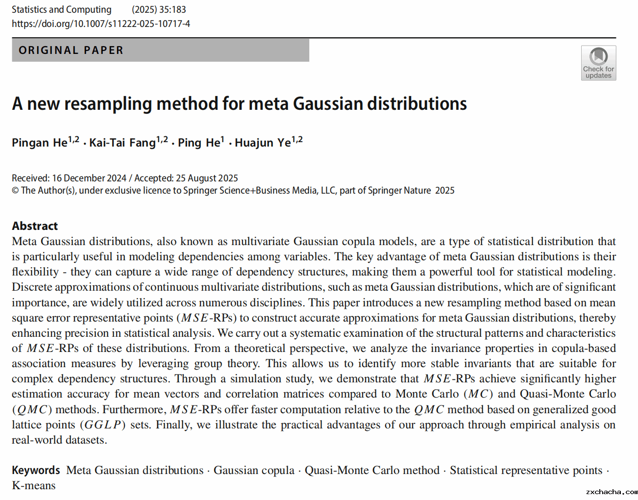 近日,北师香港浸会大学(BNBU)优米彩票app统计与数据科学系概率论与数理统计专业2023级博士生何平安,以第一作者身份在国际一流统计期刊《Statistics and Computing》上发表了题为《A new resampling method for meta Gaussian distributions》的研究论文。