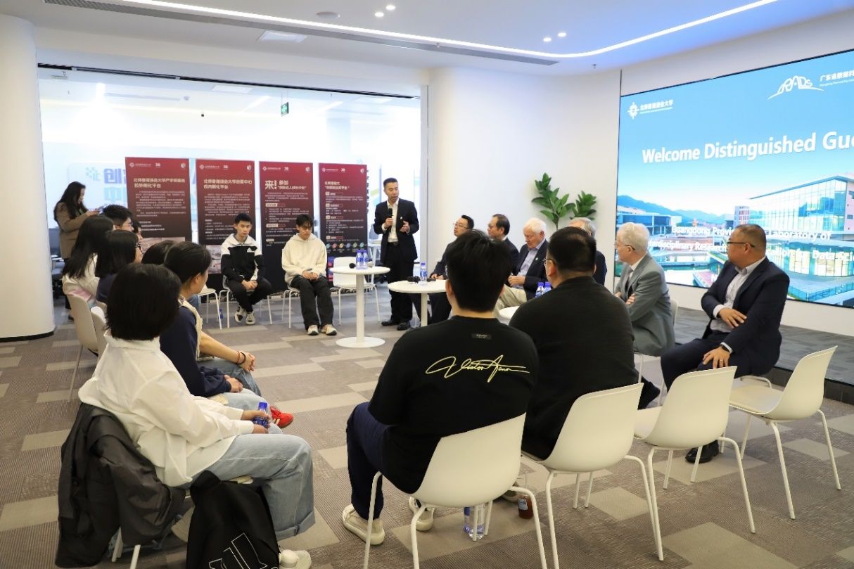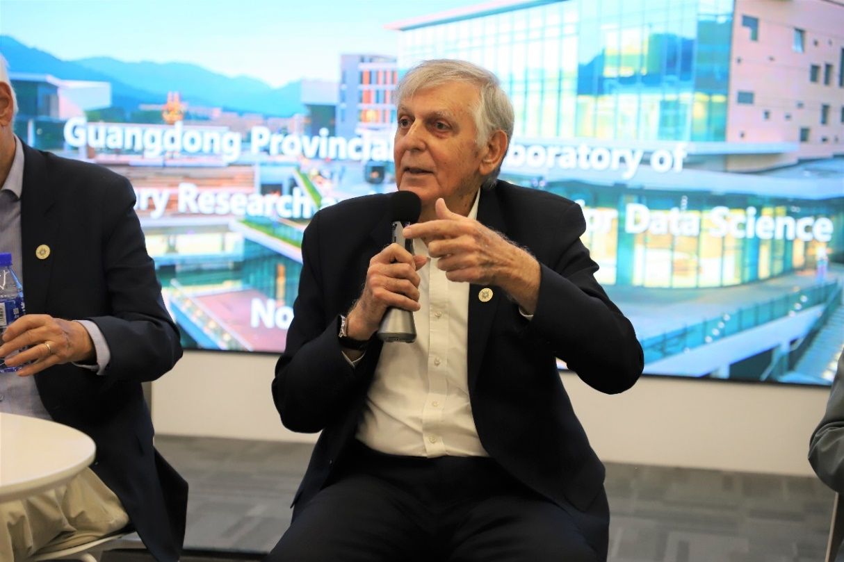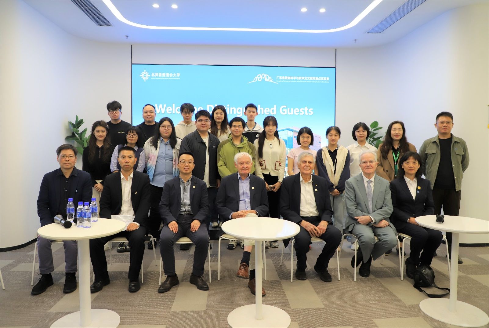 2025年11月18日, 值北师香港浸会大学 (BNBU) 20周年校庆纪念日之际,广东省数据科学与技术交叉应用重点实验室(以下简称“重点实验室”)举行了一场特别的嘉宾座谈会, 邀请2017年诺贝尔化学奖得主 Joachim Frank 教授、2011年诺贝尔化学奖得主 Dan Shechtman 教授,以及法国国家科学院和德国国家科学院院士 Eric Westhof 教授,与13位生命科学系的学生代表进行面对面交流。 副校长(研究和拓展)、重点实验室主任潘建新教授, 署理院长叶华军教授,副院长邓宇辉教授等多位重点实验室成员出席了本次活动。在座谈开始前, 重点实验室主任潘建新教授首先致欢迎辞, 对三位嘉宾的到访表示诚挚欢迎,并鼓励同学们把握机会,与世界级科学家深入交流。座谈会由 生命科学系系主任、重点实验室管理委员会成员徐宝军教授主持。