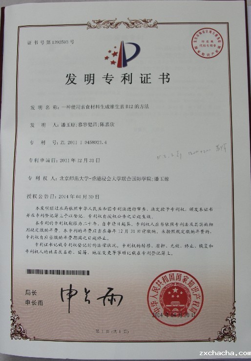 2014年4月30日,国家知识产权局正式授 予潘博士和两名UIC学生联合申请的“一种使用素食材料生成维 生素B12的方法”的专利权,这是UIC获得的第一个专利权。谈起这个发明专利权,潘博士说:“UIC和香港的很多大学一样,每年都会让学生做Final Year Project(毕业研究项目,简称FYP)。2011年我就给学生选定了素食材料生成维生素B12的方向。先后做了两年,第一年并不是很成功,第二年才 取得成果。在研发期间,由于学校实验设备不足,我们采用了低成本的发酵方法。但即便这样,一些仪器也很难在国内买到。我们只能自己设计图纸,然后通过香港 浸会大学的Workshop定做。”