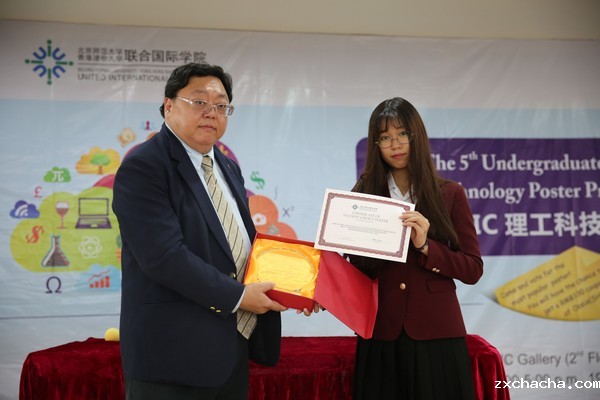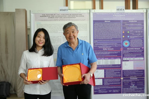 “最佳海报奖”获得者林宇璇和FYP导师方开泰教授在她的作品前合照