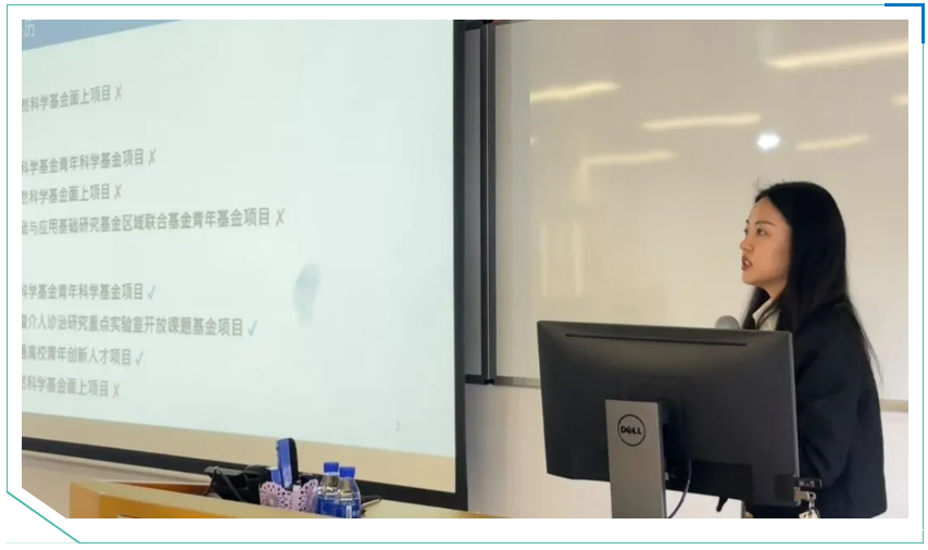 王娅博士紧接着分享了她的申请经验。王老师详尽地分享了自己过往申请尝试中得到的评审反馈,以及自己如何针对评审建议有针对性地对项目申请书做出调整。她强调了在申请基金时,需要有清晰的研究目标和详细的计划。她还建议老师们在申请基金时,应尽早开始准备,以充分了解基金的申请要求和评审标准,有足够的时间打磨本子。