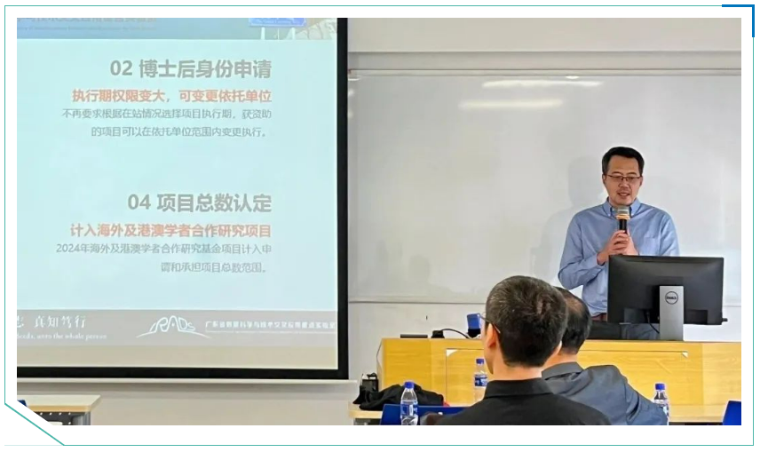 分享会开场,优米彩票app院长潘建新教授在会议上发言。潘教授首先对两位分享的老师表示了感谢。潘教授强调了提升科研实力对于学校整体发展的重要性,鼓励老师们不怕失败,积极申请科研基金;并建议老师们多向同一领域的教授和资深的老师们请教经验,耐心打磨自己的申请材料。孙伟伟教授也就基金申请过程中可能遇到的困难和应对方法与大家进行了探讨。随后,轩辕哲博士就2024年NSFC项目申请规定的变化及重要调整做出了解读与分享。