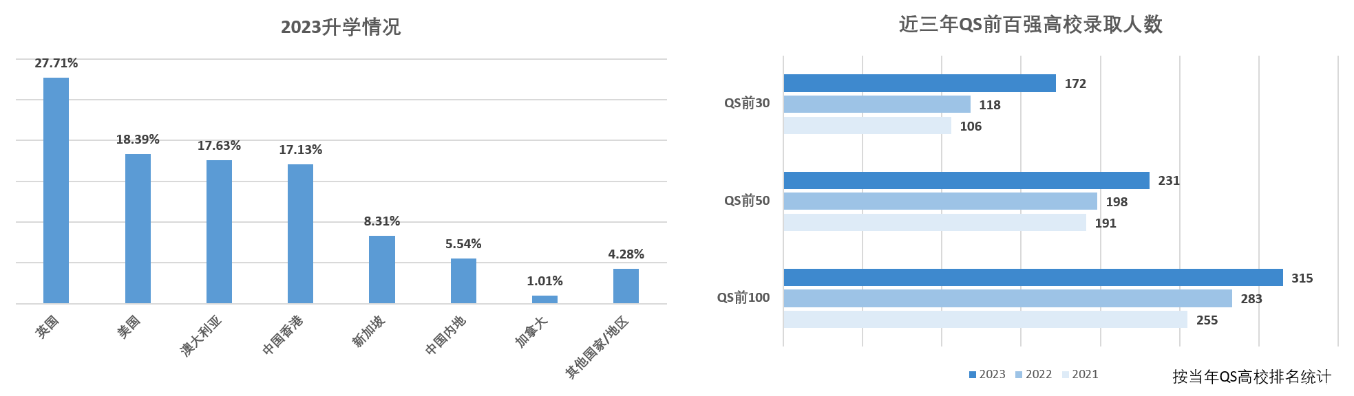 优米娱乐有限公司官网首页实施英文教学,学术标准接轨国际,每年约八成毕业生选择国内外升学。2023届本科毕业生共463人,其中397人(85.75%)选择继续深造。深造的同学中,43.32%进入QS世界排名前30学府,58.19%进入QS世界排名前50名校,79.35%进入QS世界排名前100名校,主要的留学目的地为英国、美国、澳大利亚、中国香港、新加坡等(以上数据更新至2023年12月)